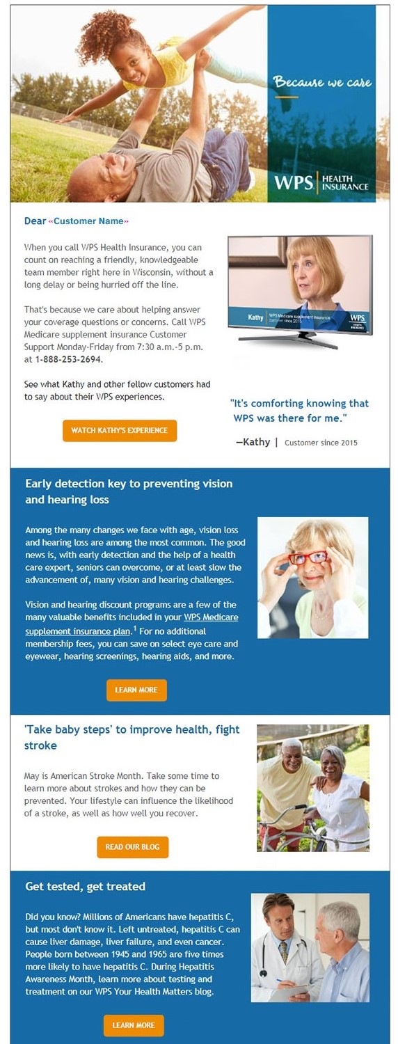 Curated and wrote content to support company’s strategic priorities as editor of monthly newsletter targeted to WPS Health Insurance Medicare supplement insurance customers. Achieved above-industry standard open rate of 50% and click rate of 9%.